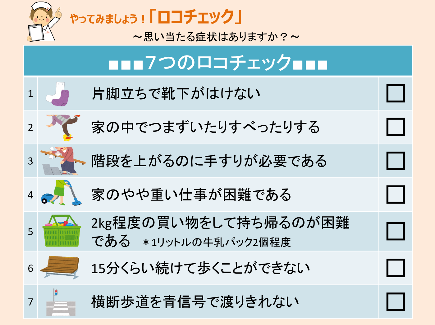 転倒といえば筋力低下によるロコモティブ症候群があります。ロコモティブシンドローム*(運動器症候群)とは、筋肉や骨、関節、椎間板といった運動器に障害が起こり、日常生活に何らかの支障が発生している状態を指します。このロコモティブシンドローム(以下ロコモ)が進行すると介護が必要になることもあり、予防がとても大事です。